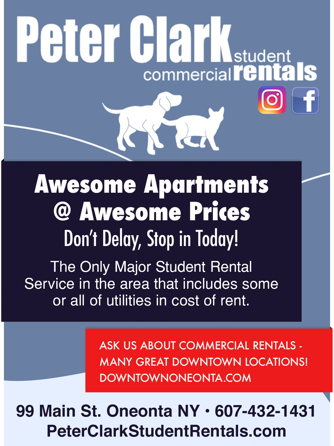 “We have been the recognized leader in Oneonta off-campus student housing for more than 40 years, and we pledge to do everything in our power to remain number one in both quality and safety. Our goal is to provide the safest, cleanest, most comfortable living spaces in this city. Our company is driven by the belief that you shouldn’t have to live in substandard housing, or be taken advantage of just because you’re a student.” – Peter Clark