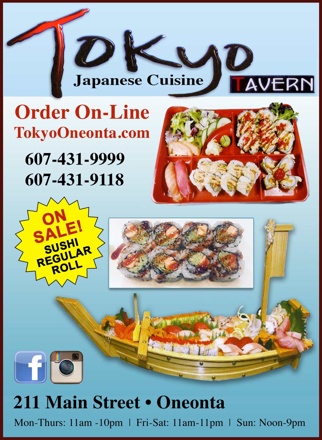 Tokyo Japanese Cuisine is a cornerstone in the Oneonta community and has been recognized for its outstanding Sushi cuisine, excellent service and friendly staff.